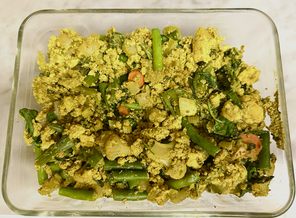 Stir everything together until the tofu, vegetables, and spices are evenly mixed and cooked through.
